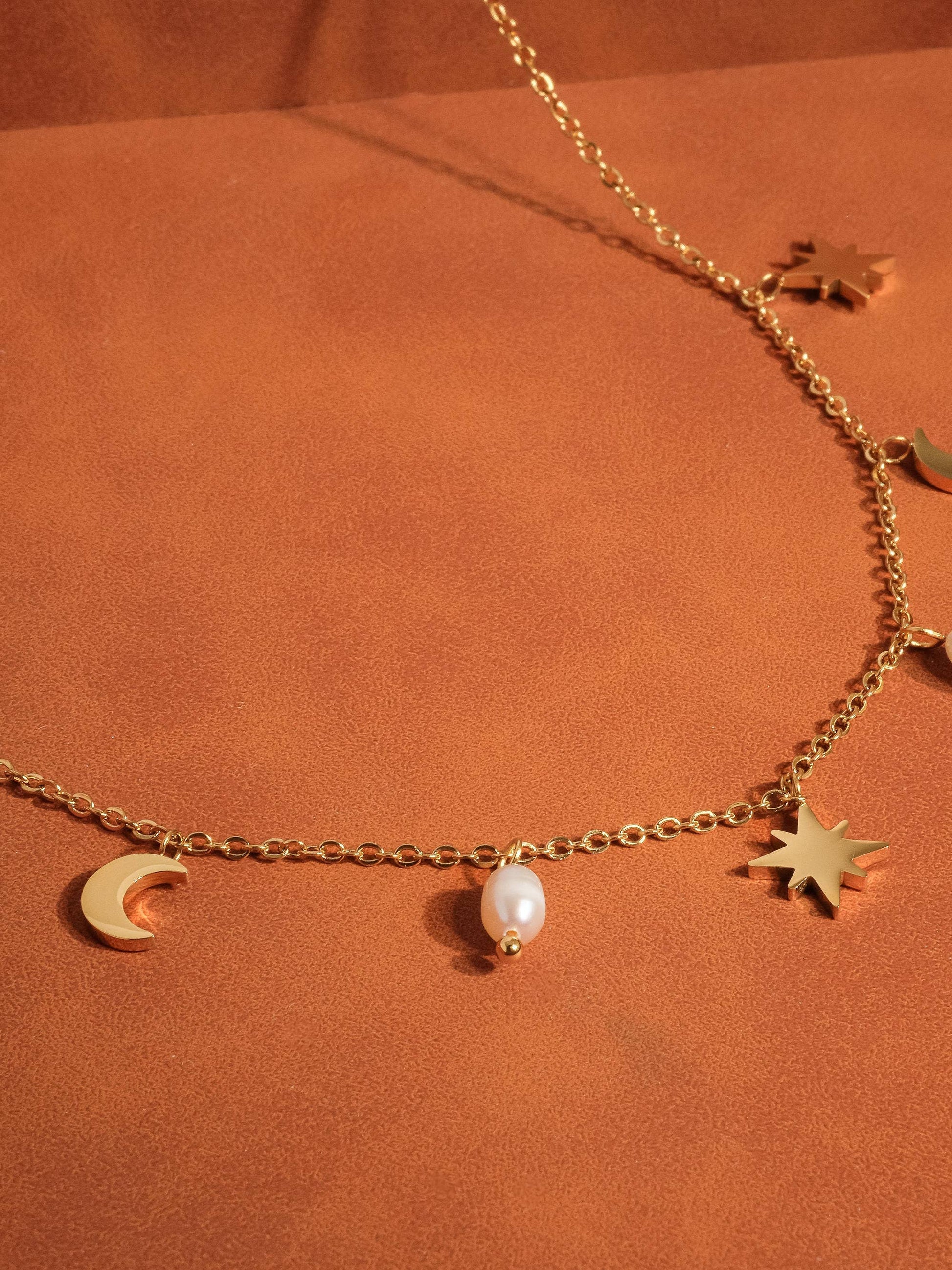 - Freshwater pearl chain with moon and star accents