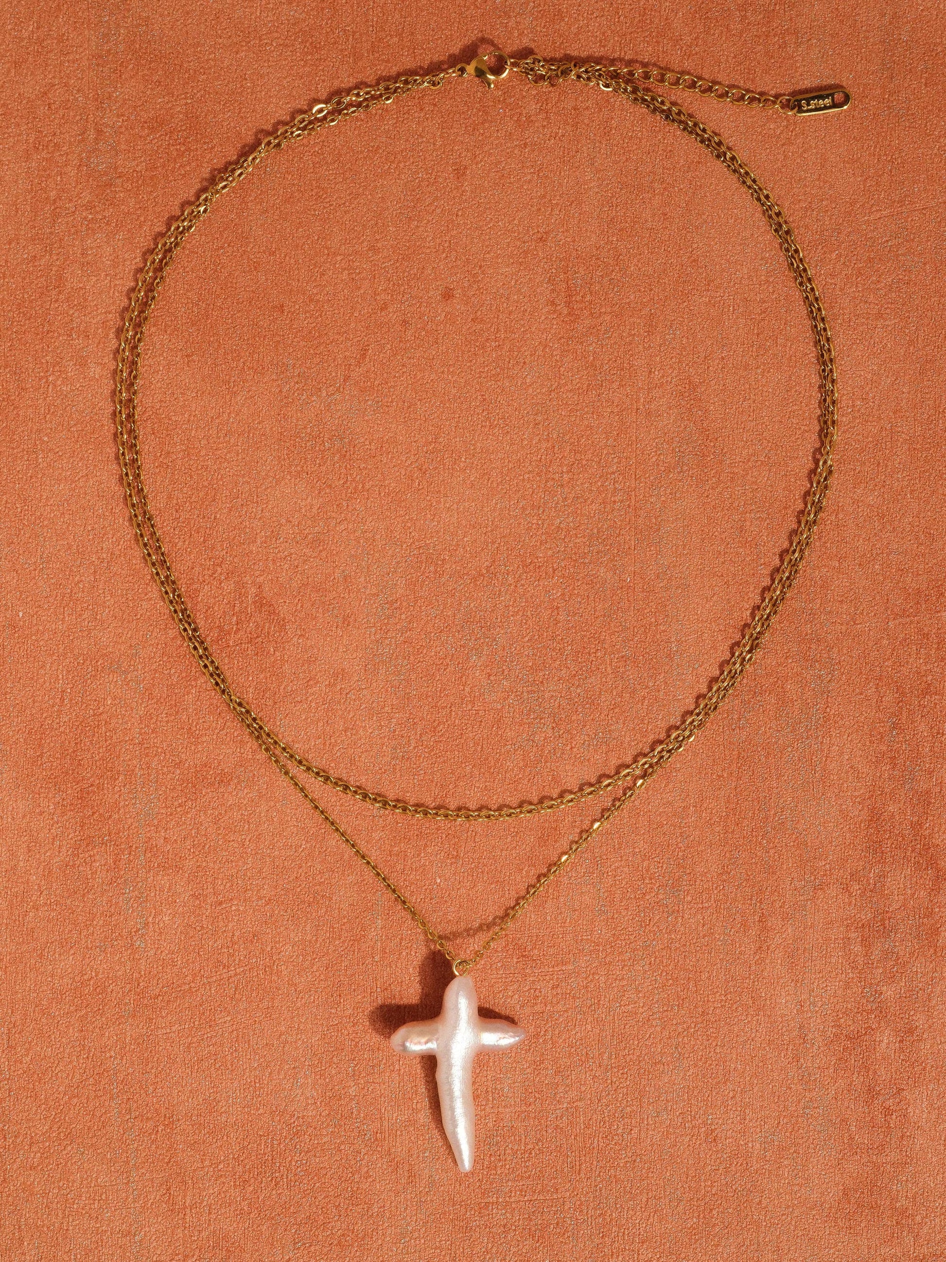 This 18K gold–plated freshwater pearl cross necklace is designed to be both meaningful and effortlessly wearable. Crafted with a non-tarnish, water-resistant stainless steel base, it’s hypoallergenic, lead-free, and nickel-safe for everyday comfort. The cultured pearl cross pendant adds a timeless, soulful touch, suspended from an adjustable chain made for layering or wearing on its own.